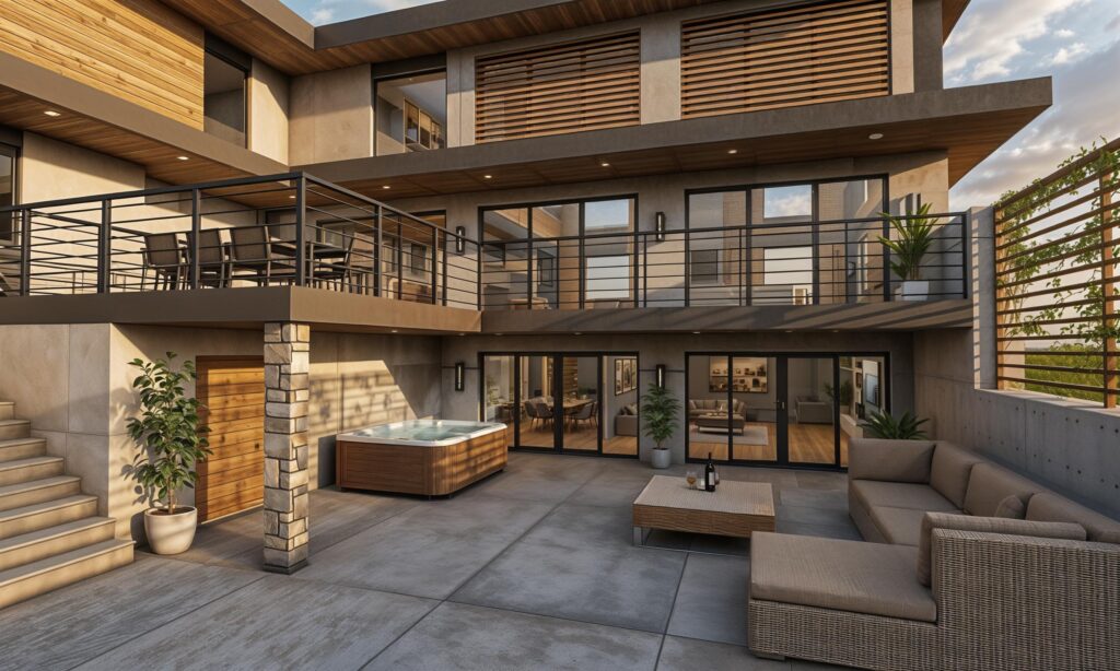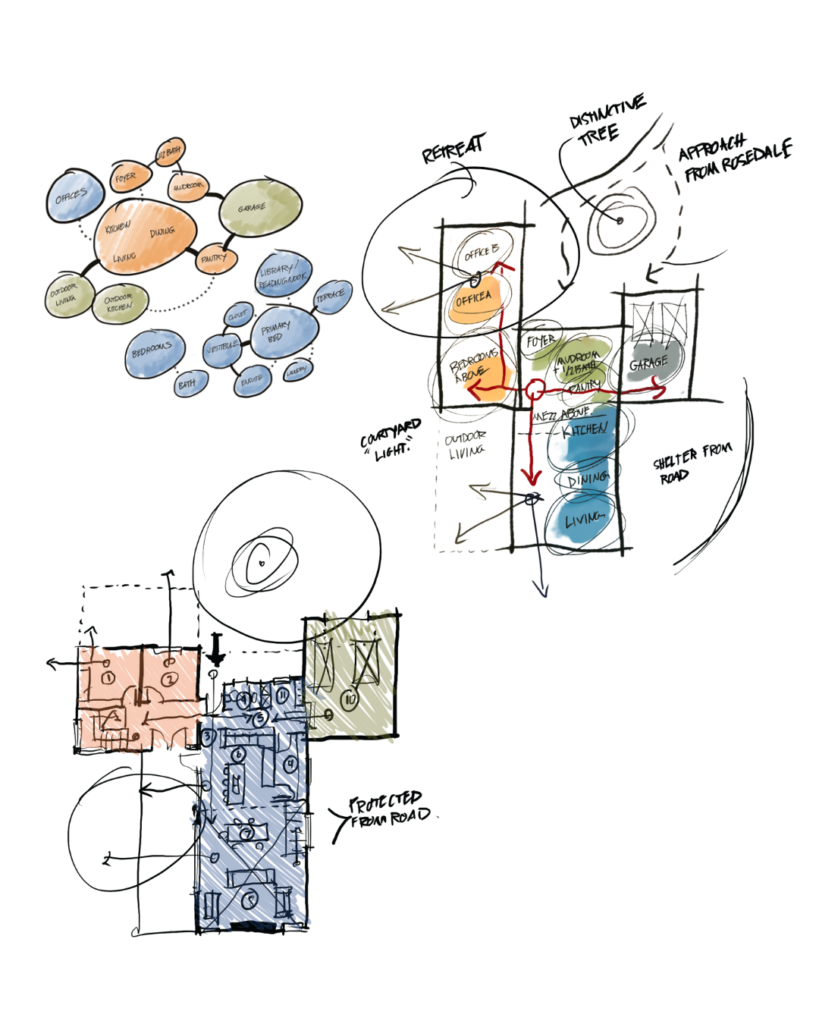 Organized into three distinct volumes, the plan defines retreat spaces, a public social core, and a functional arrival wing. Between these, two courtyards buffer prevailing winds, harness southern light, and extend daily life into the outdoors. A pronounced circular opening punctuates the façade, recalling the simplicity of a birdhouse – an emblem of retreat and protection amongst the trees. More than a visual gesture, it represents the projects underlying narrative: a home as both a refuge and outlook, forged from context, material and intention.
